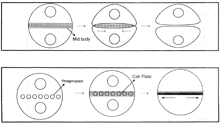 In animals center of cytokinesis occurs by constriction & furrow formation. Microtubules and microfilaments arrange on equator to form midbody and at the periphary of the equator a contractile ring is formed that is made up of actin and myosin protein. Due to interaction between actin and myosin ring centrad thus a furrow forms from the out side to inside in cell. Furrow deepens continuosly and ultimately a cell divides into two daughter cells. In animals cytokinesis occurs in centripetal order.