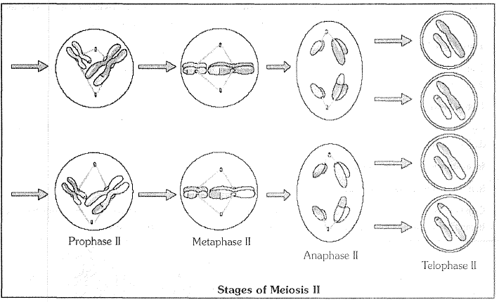 `->` Meiosis II is initiated immediately after cytokinesis, usually before the chromosomes have fully elongated. In contrast to meiosis L meiosis II resembles a normal mitosis. The nuclear membrane disappears by the end of prophase II. The chromosomes again become compact.