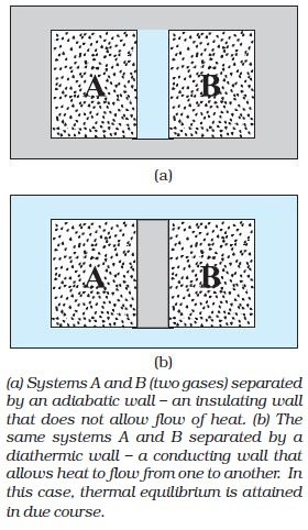 Consider two gases A and B occupying two different containers. Let the pressure and volume of the gases be (`P_A, V_A`) and (`P_B, V_B`) respectively. Suppose first that the two systems are put in proximity but are separated by an adiabatic wall - an insulating wall (can be movable).