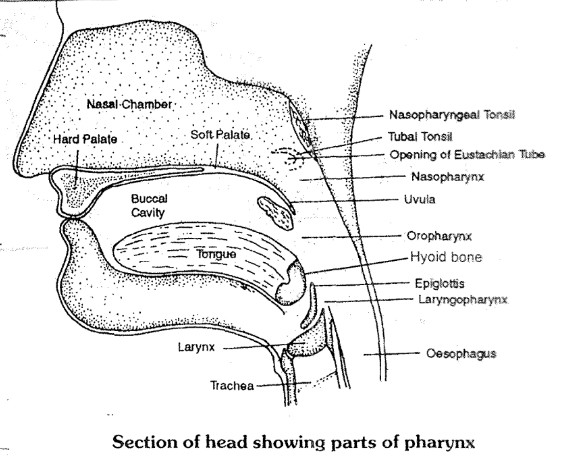 # Soft palate is situated in pharynx and is divided into two parts. Upper part of pharynx is called Nasopharynx which is relate to nasal chamber. The lower part of pharynx is called oropharynx which is related to oral cavity. One pair of opening