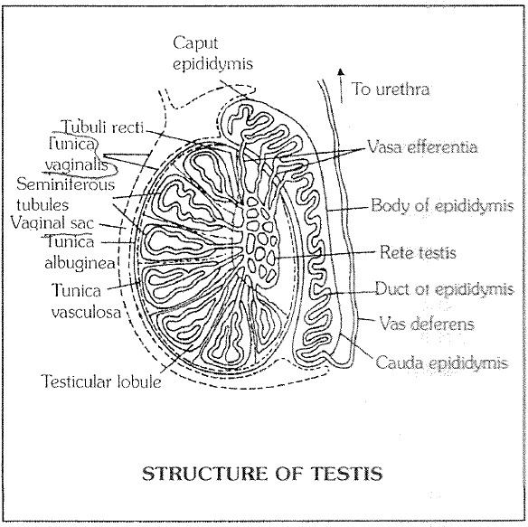 (1) Protective coats (Tunicae) : Each testis has three coverings tunica vaginalis, tunica albuginea and tunica vasculosa. On one side each testis is covered by hollowed tunica vaginalis, a bilayer of peritoneum with a narrow coelomic cavity having coelomic fluid for sliding. The actual covering of testis is a fibrous connective tissue sheath called tunica albuginea. Tunica albuginea also projects inside testis to form a vertical coloumn called mediastinum and a number of transverse septa.