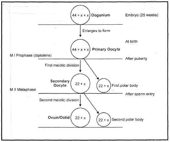 After fertilization, the second meotic division is completed with unequal cytoplasmic cleavage. This forms a large cell the ootid with essentially whole of the cytoplasm, and a very small cell, the second polar body. The ootid and the second polar body are haploid as the second meotic division is equational. The first polar body may divide at about the same time into two polar bodies.