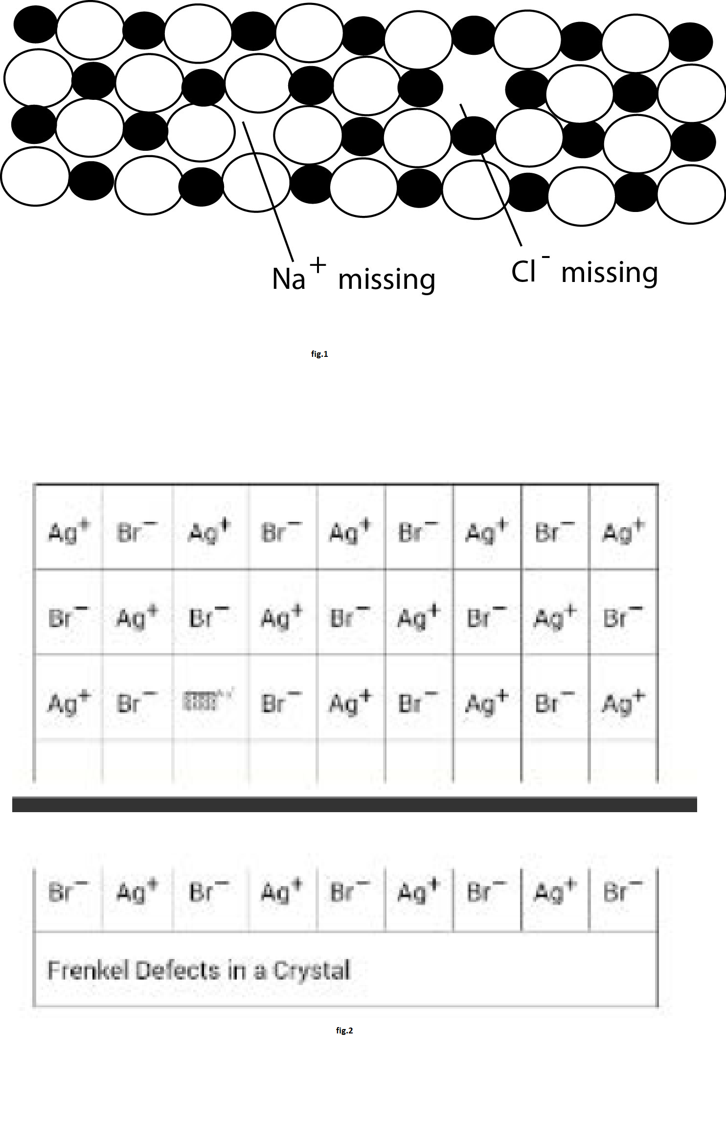 (ii) `text(Metal Deficiency Defects)` : In certain cases, one of the positive ions is missing from its lattice site and the extra negative charge is balanced by some nearby metal ion acquiring two charges instead of one. There is evidently, a deficiency of the metal ions although the crystal as a whole is neutral. This type of defect is generally found amongst the compounds of transition metals which can exhibit variable valency. Crystals of `FeO`, `FeS` and `NiO` show this type of defects. The existence of metal deficiency defects in the crystal of `FeO` is illustrated.