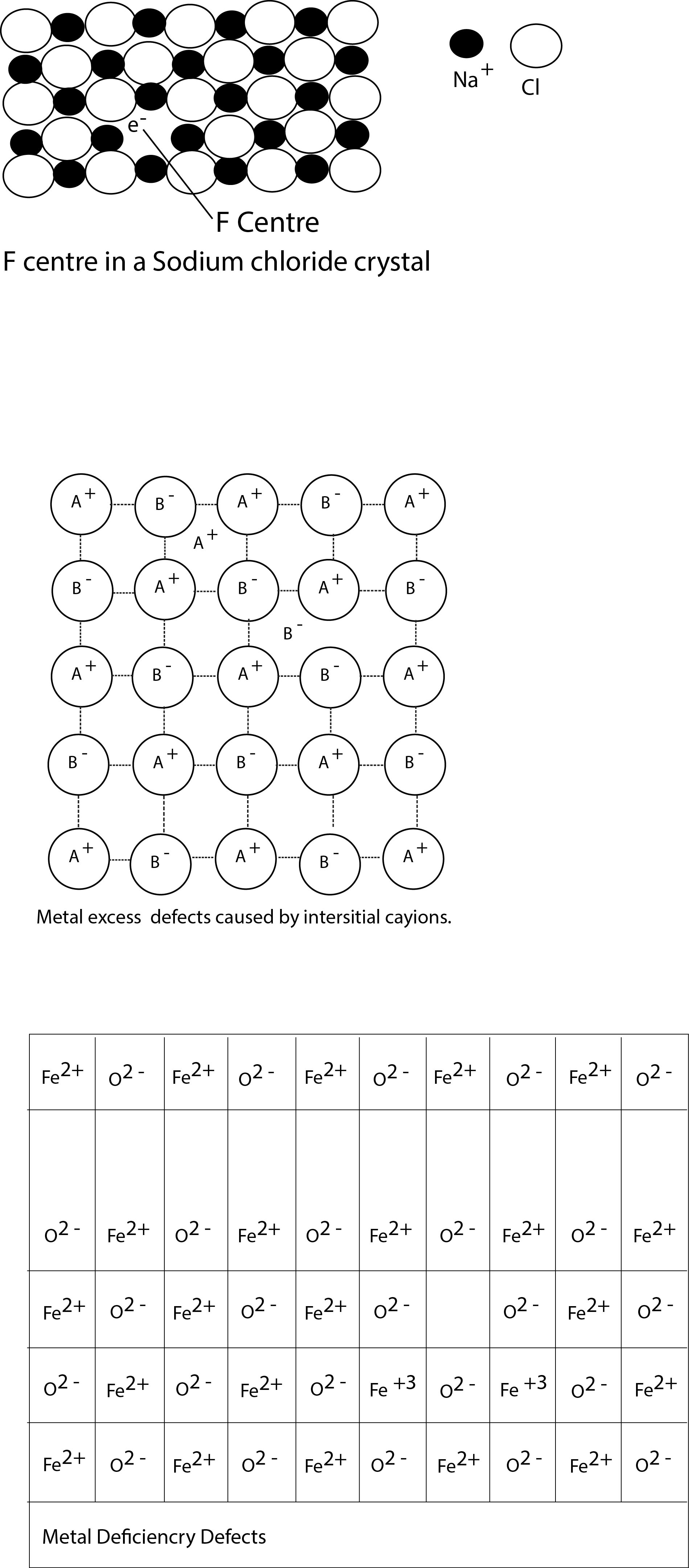 F-Centres : A negative ion may be absent from its lattice site leaving a hole which is occupied by an electron, thereby maintaining the electrical balance. This type of defect is formed by crystals which would be expected to form Schottky defects. When compounds such as `NaCl`, `KCl` are heated with excess of their constituent metal vapours, or treated with high energy radiation, they become deficient in the negative ions and their formulae may be represented by `AX _(1- d)`, where `d` is a small fraction. The crystal lattice has vacant anion sites which are occupied by electrons. Anion sites occupied by electrons in this way are called `F` centres (`F` is an abbreviation Farbe, the German word for colour).