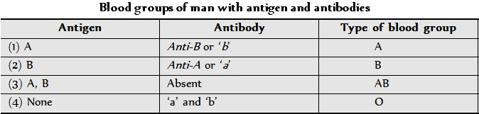 (1) ABO blood group : Landsteiner divided human population into four groups based on the presence of antigens found in their red blood corpuscles. Each group represented a blood group. Thus there are four types of blood groups viz. A, B, AB and O. He observed that there was a reciprocal relationship between antigen and antibody according to which a person has antibodies for those antigens which he does not possess. For example a person of blood group B does not possess antigen A but his blood plasma has antibody ‘a’ due to which agglutination with the blood of a person with blood group A occurs. Similarly persons with blood group AB possess both the antigens A and B but their blood plasma does not possess any of the antibodies. In the same way person having blood group A does not possess antigen B but antibody ‘b’ is found in his blood plasma. Persons with blood group O possess none of the antigens and that is why their blood possesses both the antibodies ‘a’ and ‘b’.