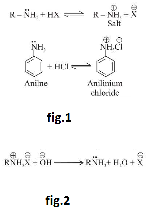 Amines are relatively weak bases. They are stronger bases than water but are far weaker bases than hydroxides ions (`OH^-`), alkoxide ions (`RO^-`) and alkanide (`R:^-`) anions. These react with acids to form salts. See fig.1.