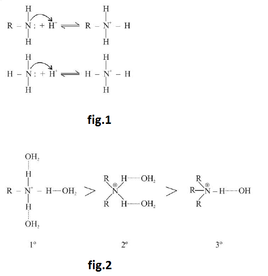 Primary alkanamines `(RNH_2)` are more basic than ammonia `(NH_3)`. Their reactions with proton can be used to compare their basicity. See fig.1.