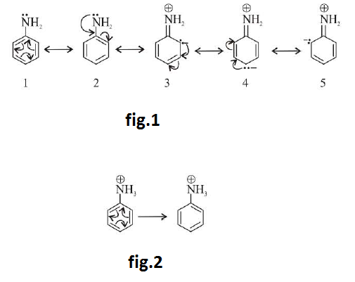Structure `1` and `2` are the Kekule structures that contribute to any benzene derivative. Structures `3`-`5`, however, delocalize the unshared electron pair of the nitrogen over the ortho and para position of the ring. This delocalizarion of the electron pair make it less available to a proton, and delocalization of the electron pair stabilizes aniline. When aniline accepts a proton it becomes an anilinium ion :