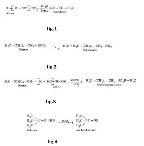 Sulphonation : The reaction in which `H` atoms of alkanes are replaced by sulphonic acid group `(-SO_3H)` is called sulphonation. See fig.3.