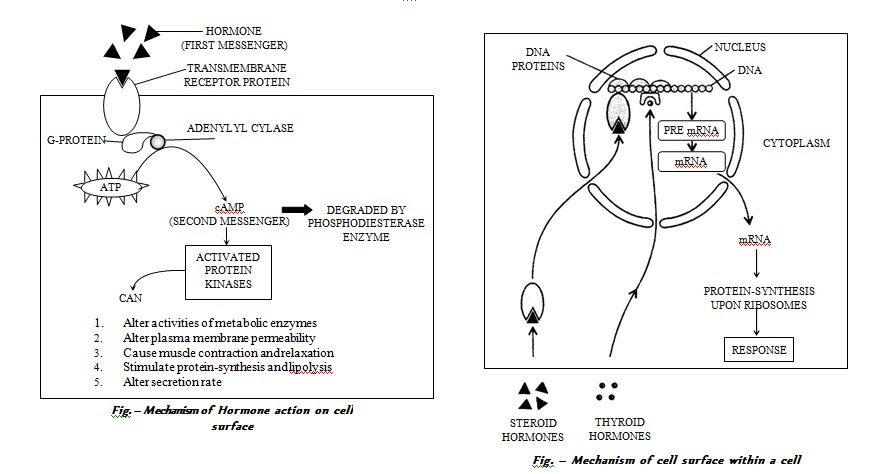 # (1) Formation of cAMP : Mechanism of formation of cAMP was discovered by E.W. Sutherland in 1950. The hormone receptor complex causes the release of an enzyme adenyl cyclase. From the receptor site. This enzyme hydrolise the ATP into c-AMP. The c-AMP activates the existing enzyme system of the cell. This accelerates the metabolic reactions in cell. The hormone is called first messenger and the c-AMP is termed the second messenger. e.g. Adrenaline causes the secretion of glucose from the liver cell from this mechanism.