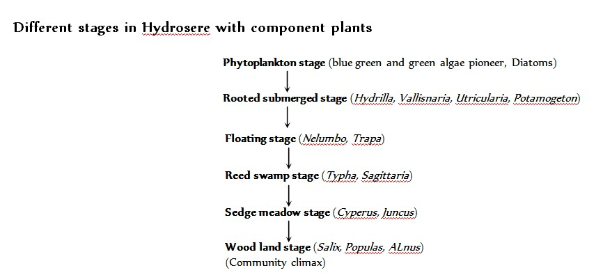 - (2) Secondary succession : It occurs where early communities have been damaged, leaving a few organisms and considerable organic matter. These remnant species, along with some new ones, regenerate a new community. Ecological succession on dry habitat, bare rock, sandy soils and aquatic habitats are called xerosere, lithosere, psammosere and hydrosere, respectively. The first plants to appear in an area are called pioneer plants. In hydrosere (or hydrach), pioneers are phytoplanktons; in lithosere, the pioneers are crustose (Saxicolous) lichens and mosses