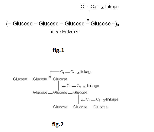 Amylopectin, on the other hand, is a highly branched polymer. It consists of a large number (several branches) of short chains each containing 20-25 glucose units which are joined together through α-linkages involving C1 of one glucose unit with C4of the other. The C1 of terminal glucose unit in each chain is further linked to C6 of the other glucose unit in the next chain through C1 – C6 α-linkage. This gives amylopectin a highly branched structure as shown below- See fig.2.