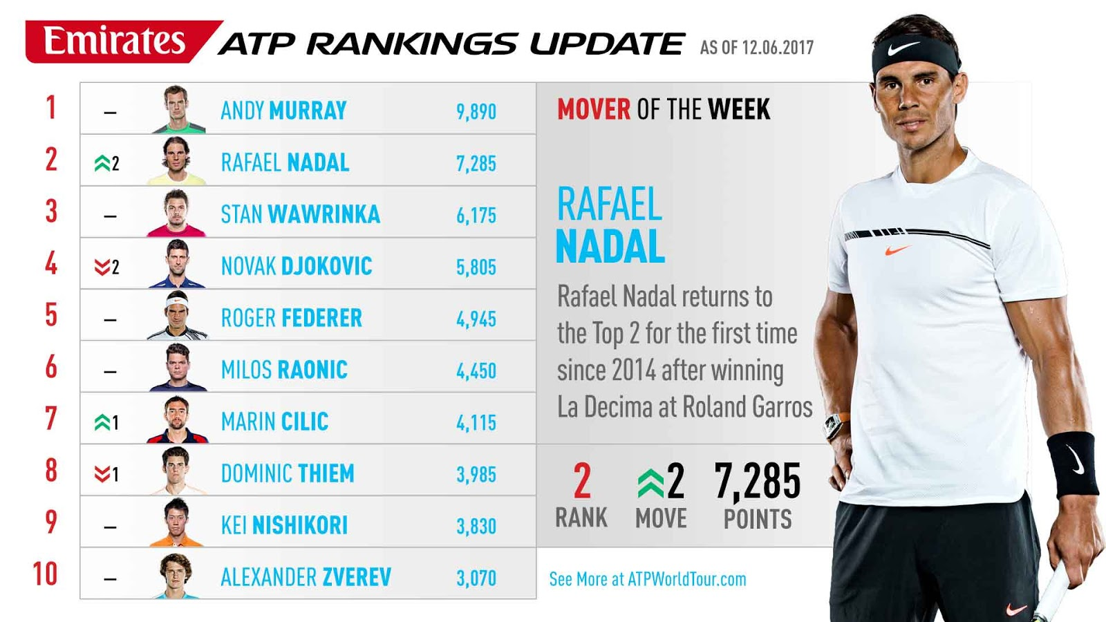 i. Rafael Nadal’s magnificent run to a 10th French Open title has earned the Spaniard a move into second in the latest ATP world rankings.