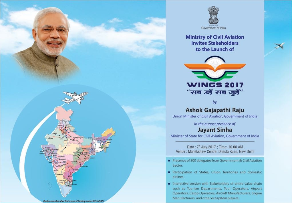 i. The First edition of WINGS 2017 – “Sab Uden, Sab Juden”- Expanding Regional Connectivity was hosted in New Delhi by the Ministry of Civil Aviation. The Plenary session was chaired by the Union Minister of Civil Aviation, Shri P. Ashok Gajapathi Raju.
